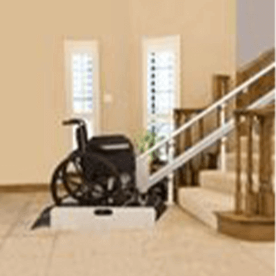 An Incline Platform Lift functions on a stairway and carries the individual with a wheel chair.