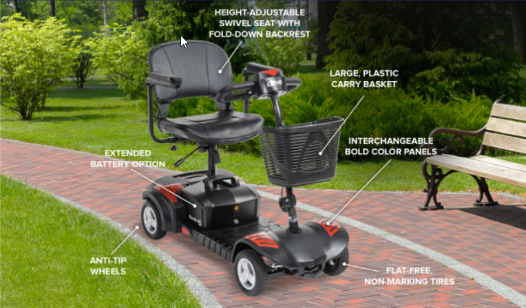 The Scout 4 Extended Range Mobility Scooter offers up to 14 miles per charge, making it an excellent choice for all-day use while remaining lightweight and portable. It easily disassembles for transport, making it ideal for an on-the-go lifestyle. With features like a delta tiller for one-handed control, adjustable armrests, a front storage basket, anti-tip wheels, and flat-free tires, it delivers both comfort and convenience.